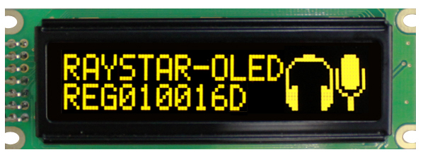 REG010016DYPP5N00000 — OLED-дисплей, графический, Module dimension: 85 X 30.0 X 10 (max.) mm3, View area: 66x16 mm2, Active area: 59.95 x 11.15 mm2, Number of dots: 100 x 16, Duty: 1/16, Emitting Color: YELLOW