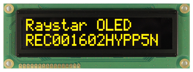 REC001602HYPP5N00000 — OLED-дисплей, C: Character Type; Number of dots: 16 Characters, 2 Lines. Y: Yellow P: With Polarizer; P: Passive Matrix; N: Without touch panel, 0:Normal, N; коэффициент мультиплексирования: 1/16; Driver Voltage: 5VDC
